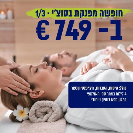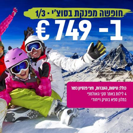 מתי? מסלול ראשון ב 1/3 מה בחבילה? 4 לילות כולל טיסות והעברות, חצי פנסיון, כשר. חופשה מפנקת במלון ספא בוטיק ייחודי. והמחיר? לאדם בחדר זוגי 749 יורו. לפרטים נוספים לחצו כאן או חייגו ל kosherway בטלפון 035158080 אירוח מפנק במלון בוטיק וייחודי: מלון Dolina 960 *4 ממוקם באתר הסקי אסטוסאדוק, (Estosadok) במרחק של 200 מ' ממעלית הסקי גורניה קארוסל (Gornaya Karusel), המשקיף על נוף עוצר נשימה. המלון מציע לאורחים ,חדרי אירוח מרווחים, מעוצבים באלגנטיות, וכוללים טלוויזיה בעלת מסך שטוח וחדרי רחצה פרטיים עם חלוק רחצה ומוצרי טיפוח ללא תשלום. וכן WI-FI חינם.המלון ממקום במרחק נסיעה של 50 דקות נסיעה מנמל התעופה הבינלאומי אדלר-סוצ'י (Adler-Sochi), ובמרחק של כ 15 דקות נסיעה מתחנת הרכבת קראסניה פוליאנה (Krasnaya Polyana)