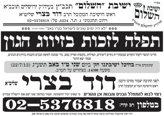 התפילה תתקיים בישיבת המקובלים "השלום" רחוב תחכמוני 1 ירושלים