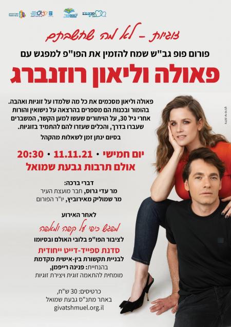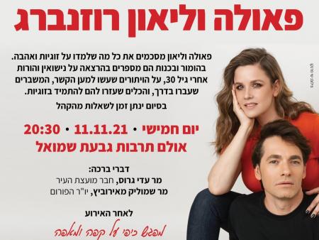 בהומור ובכנות הם מספרים בהרצאה על נישואין והורות אחרי גיל 30, אירוע לפנויים פנויות על הוויתורים שעשו למען הקשר, על המשברים שעברו בדרך, ועל הכלים שעזרו להם להתמיד בזוגיות.