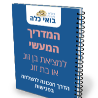 המדריך המעשי למציאת בן זוג או בת זוג - ספר דיגיטלי, פרי ניסיון של שנים רבות בתחום. המוליך את הקורא/ת צעד אחר צעד מהטלפון הראשון ועד החופה.