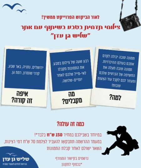 אחרי ההצלחה האדירה! תאריכים חדשים לצילומי תדמית בטבע - נתניה, ירושלים, קרני שומרון, באר שבע, רמת גן ועוד.. כל פעם במקום אחר! ההרשמה באמצעות הקישור להלן, ובמידה וייפתחו תאריכים לצילומים באיזור שבחרתם, ניצור איתכם קשר בוואטסאפ עם הזמנה לצילומים.