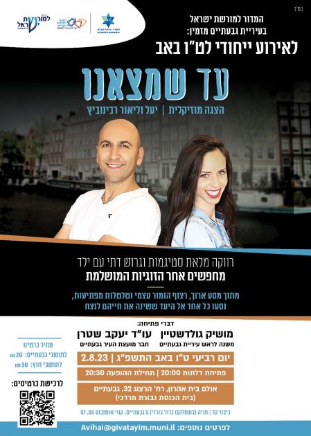 יעל וליאור מוסיפים: "אנחנו רוצים להודות ליעקב שטרן, חבר מועצת העיר גבעתיים, שהזמין את ההצגה לט"ו באב ופועל רבות בכדי לקדם את התרבות היהודית בעיר גבעתיים".