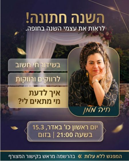 השנה חתונה! לראות את עצמי השנה בחופה. בראשון הקרוב בשידור חי חשוב לרווקים ורווקות - איך לדעת מי מתאים לי? מפגש אחרון ללא עלות >> אל תפספסו את ההזדמנות.